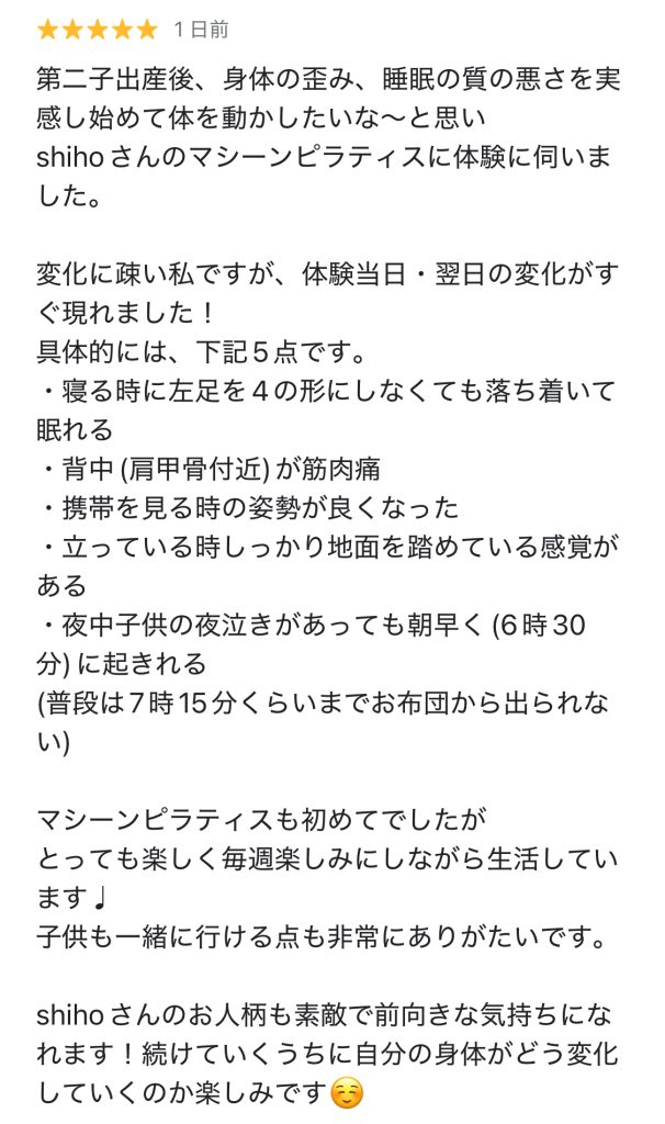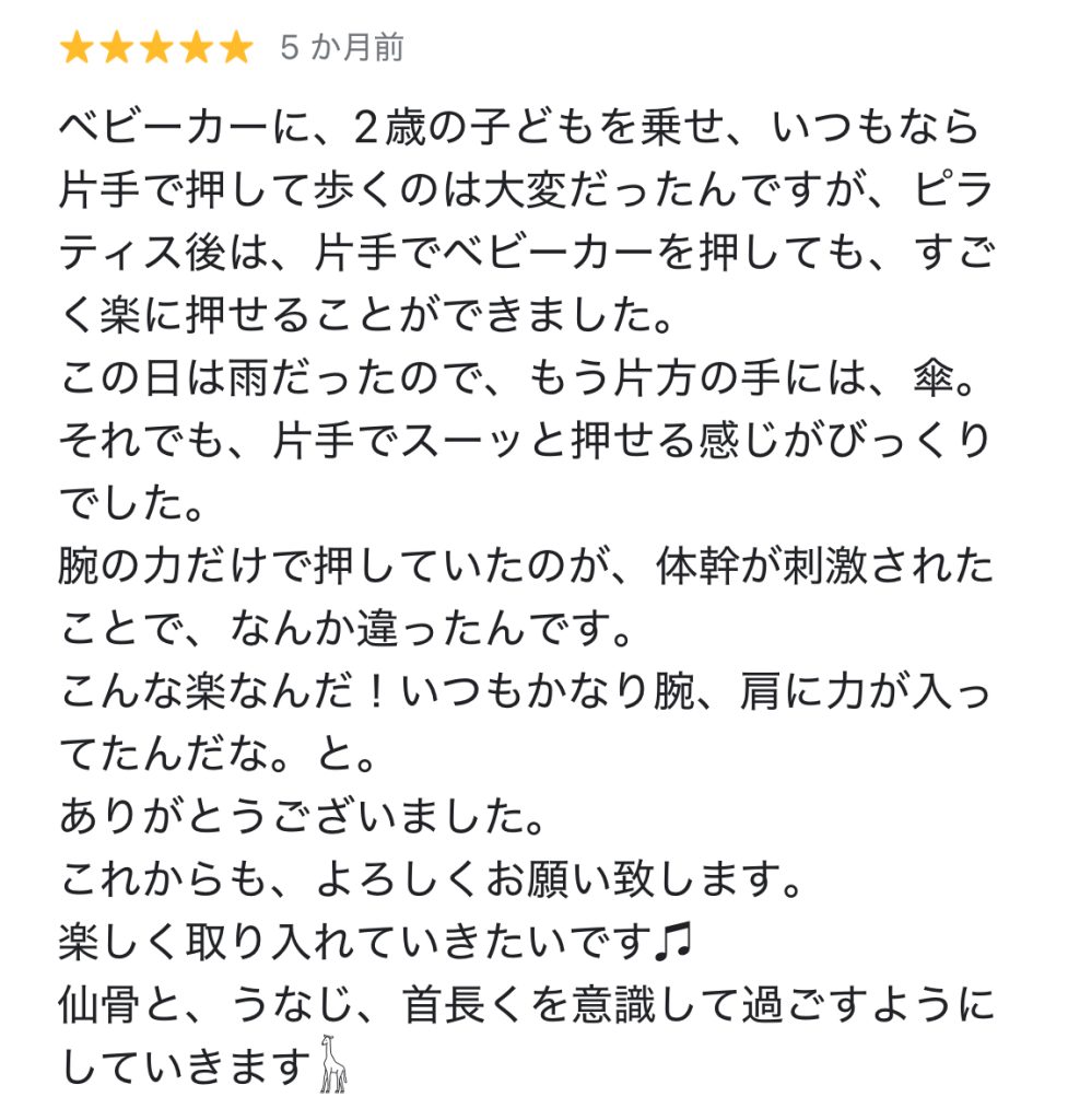 私がピラティスに出会ったのは3人子供を出産後。 それでも、 カラダは手入れしてあげた分だけ 正直に答えてくれる。 そしてカラダが整えば、 自然と心も晴れやかになるものです。 正社員×子供3人ワンオペ育児しながら 自分が体も心も変わった経験を元に ・なぜ忙しくても続けることができたのか ・なぜ運動嫌いでも変わることができたのか ・なぜ「痩せる」だけでは見た目が 理想通りにならなかったのか など、アドバイス可能です。 お子様連れもOKです。 疲れにくいキレイなカラダと ちょっとごきげんな毎日を手に入れる お手伝いができたら嬉しいです♪